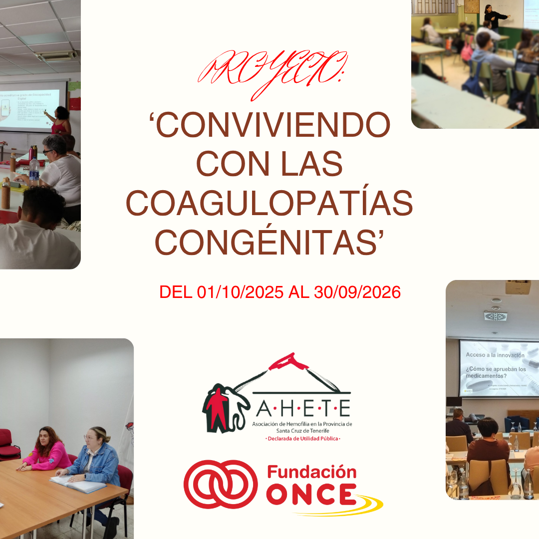 Del 01 de de octubre 2025 al 30 de septiembre 2026, AHETE ejecutará el proyecto: ‘Conviviendo con las Coagulopatías Congénitas’, el cual se encuentra financiado por la Fundación ONCE, a quien queremos agradecer un año más su apoyo.