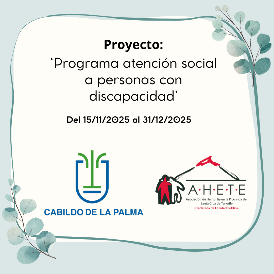 Desde el 15 de octubre hasta el 31 de diciembre, ejecutaremos nuestro proyecto: ‘Programa de Atención Social a personas con discapacidad’, financiado por el Excmo. Cabildo Insular de La Palma.