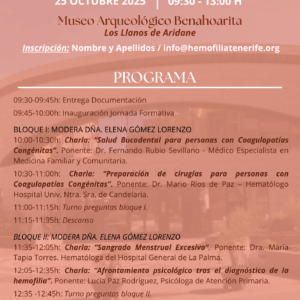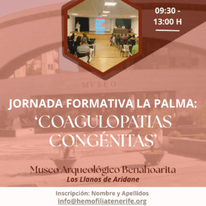 El sábado 25 de octubre, AHETE viajó a la isla de La Palma con motivo de la celebración de la Jornada Formativa sobre: ‘Coagulopatías Congénitas’, la cual estuvo dirigida a personal sanitario, colectivo, familias y sociedad interesada, la cual se celebró en el Museo Arqueológico Benahoarita – MAB.