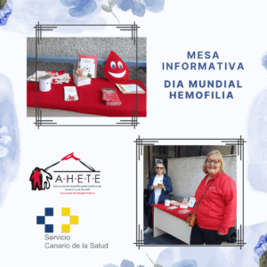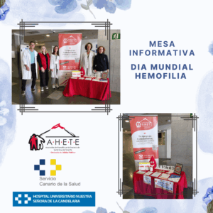 El miércoles 16 de abril, AHETE estuvo presente con un stand informativo en el Hospital Univ. Ntra. Sra. de Candelaria (HUNSC) y en el Centro de Salud de Los Llanos de Aridane (La Palma) , dando información sobre la Hemofilia y Coagulopatías Congénitas por nuestro Día Mundial de la Hemofilia (17 abril).