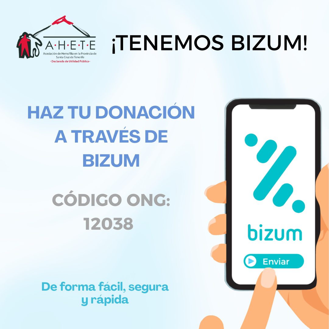 ¡Ya puedes colaborar con AHETE de forma más fácil! Ahora aceptamos donaciones a través de Bizum. Solo tienes que enviar tu aportación al Código Bizum ONG: 12038 Cada gesto cuenta y nos ayuda a seguir trabajando por las personas con coagulopatías. ¡Gracias por tu apoyo!