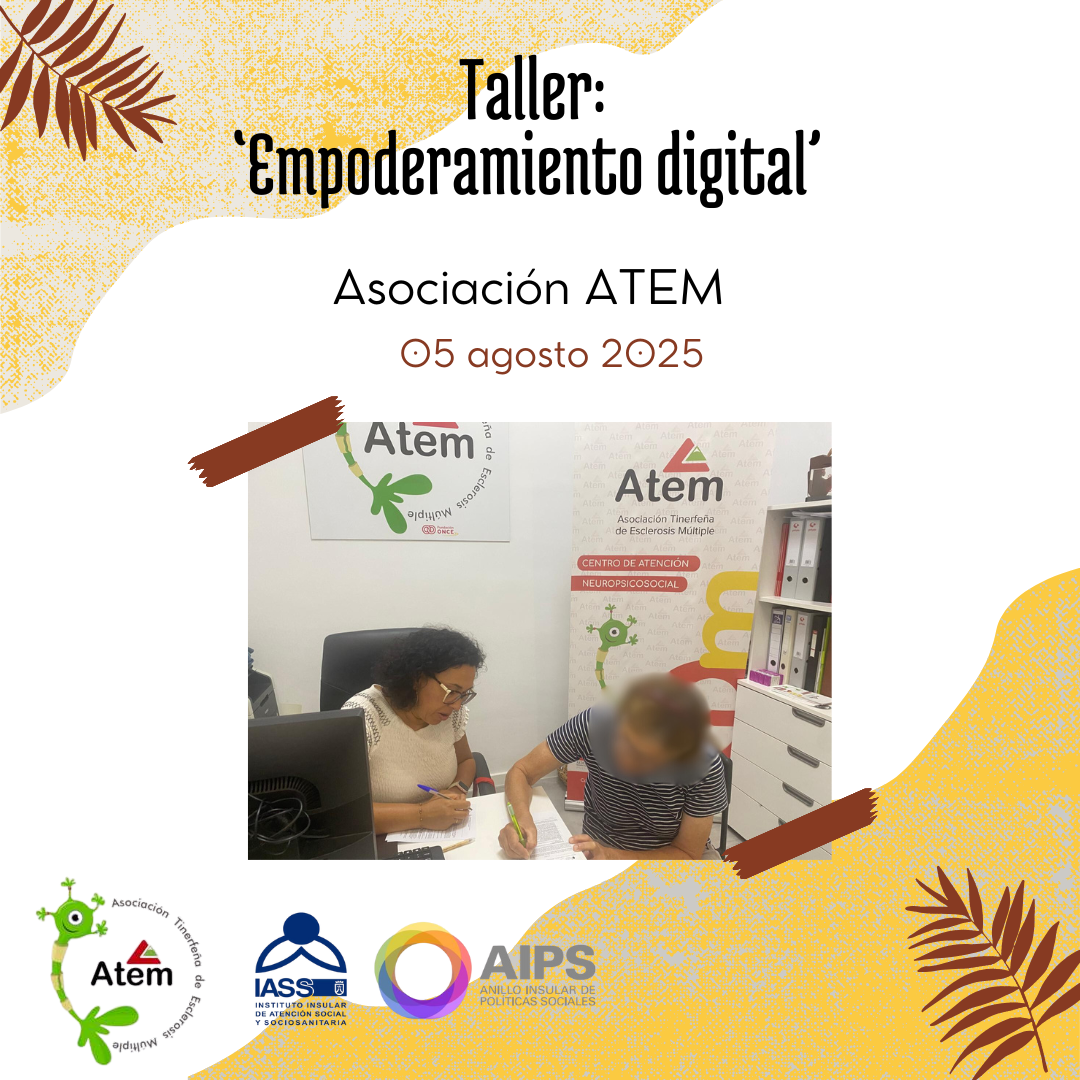 El martes 05 de agosto, nuestra compañera Toñi, técnico de la entidad, acudió a la sede de la Asociación ATEM para impartir un taller de empoderamiento digital dirigido a su colectivo, enmarcado dentro del proyecto: ‘Construyendo futuro’ financiado por el Instituto Insular de Atención Social y Socio Sanitaria de Tenerife (IASS), el Cabildo de Tenerife