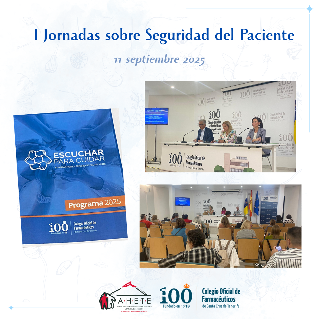 El jueves 11 de septiembre, AHETE estuvo presente en estas jornadas organizadas por el Colegio Oficial de Farmacéuticos de Tenerife bajo el lema: “Escuchar para cuidar: alianzas por la seguridad del paciente”. Estas jornadas nacen con el objetivo de consolidar un espacio de encuentro entre asociaciones de pacientes, profesionales sanitarios y autoridades, donde poder compartir experiencias,