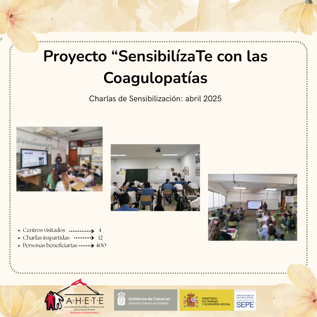 Proyecto: “SensibilízaTe con las Coagulopatías Congénitas”, financiado por el Servicio Público de Empleo Estatal (SEPE) y el Servicio Canario de Empleo (SCE). A lo largo del mes de abril, hemos tenido la oportunidad de visitar cuatro centros educativos: el IES Benito Pérez Armas, el IES Virgen del Mar, el CEIP Chigora y el CEIP Narciso Brito,