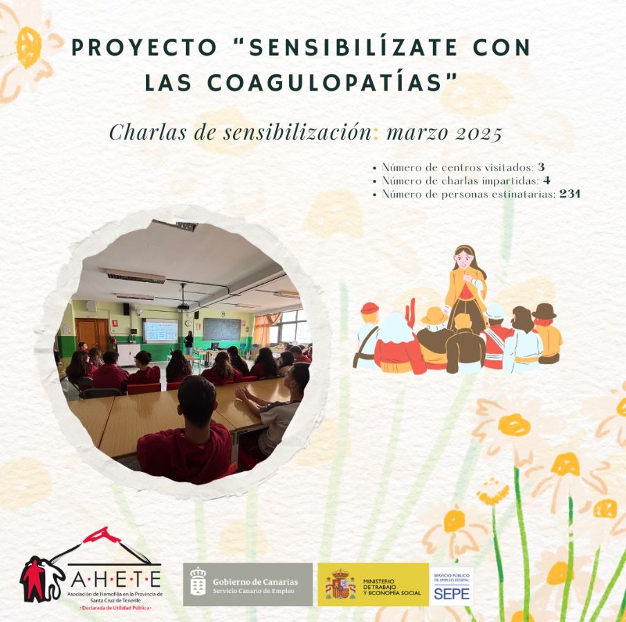 Proyecto: “SensibilízaTe con las Coagulopatías Congénitas”, financiado por el Servicio Público de Empleo Estatal (SEPE) y el Servicio Canario de Empleo (SCE). Durante el mes de marzo, hemos tenido la oportunidad de visitar tres centros educativos: el IES Santa Ana , Colegio Pureza de María (Los Realejos) y el Colegio Chamberí, llegando a impartir un